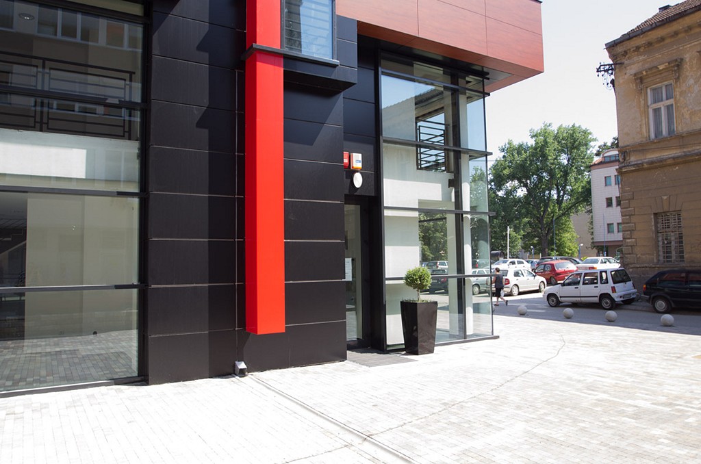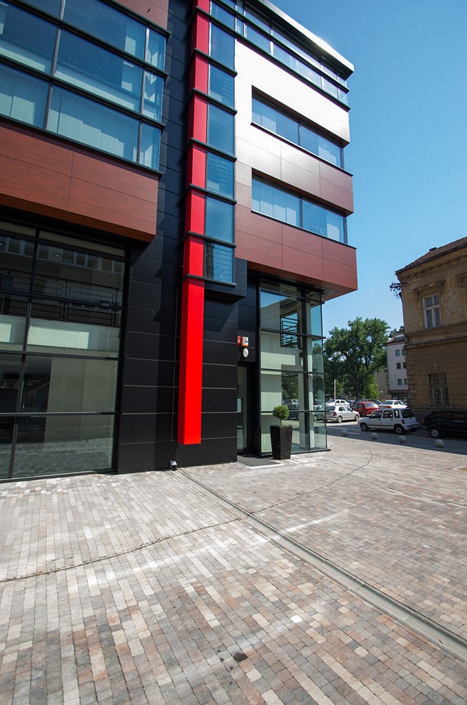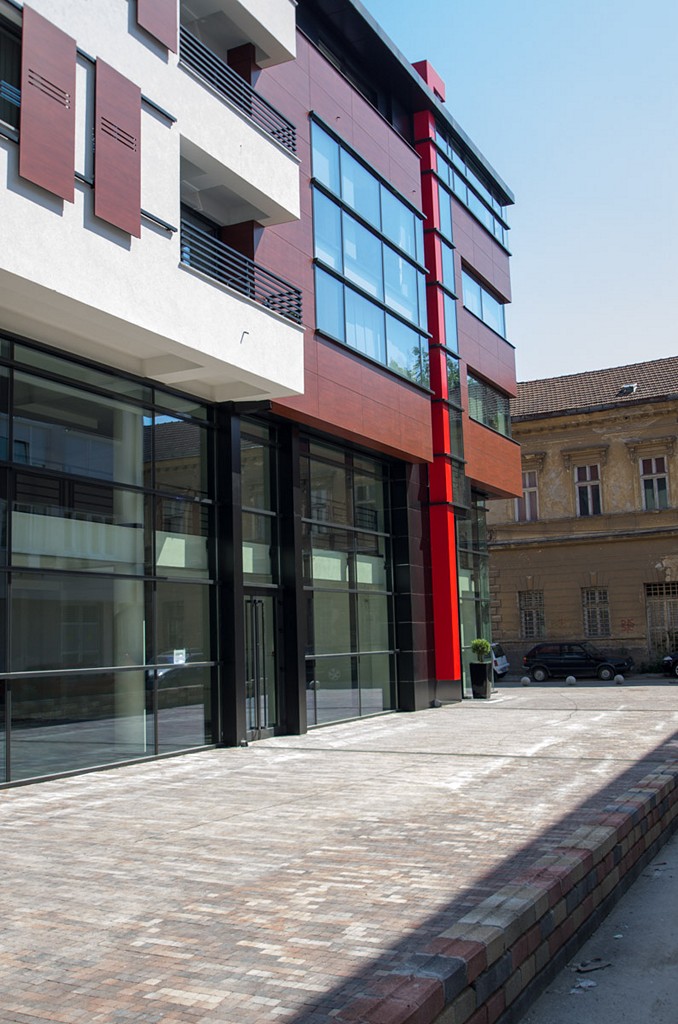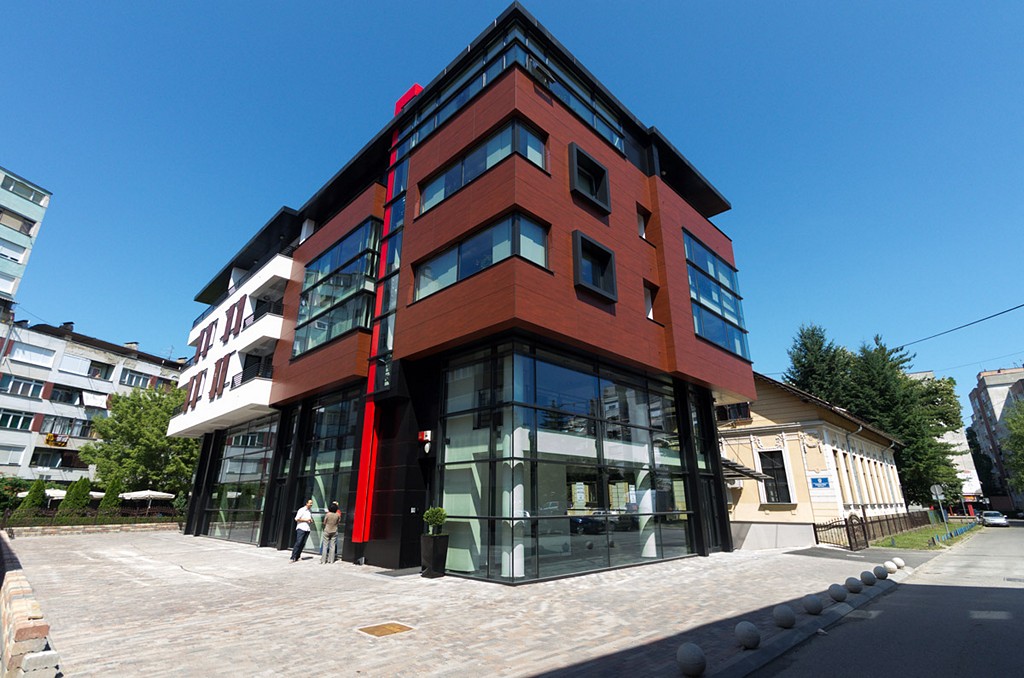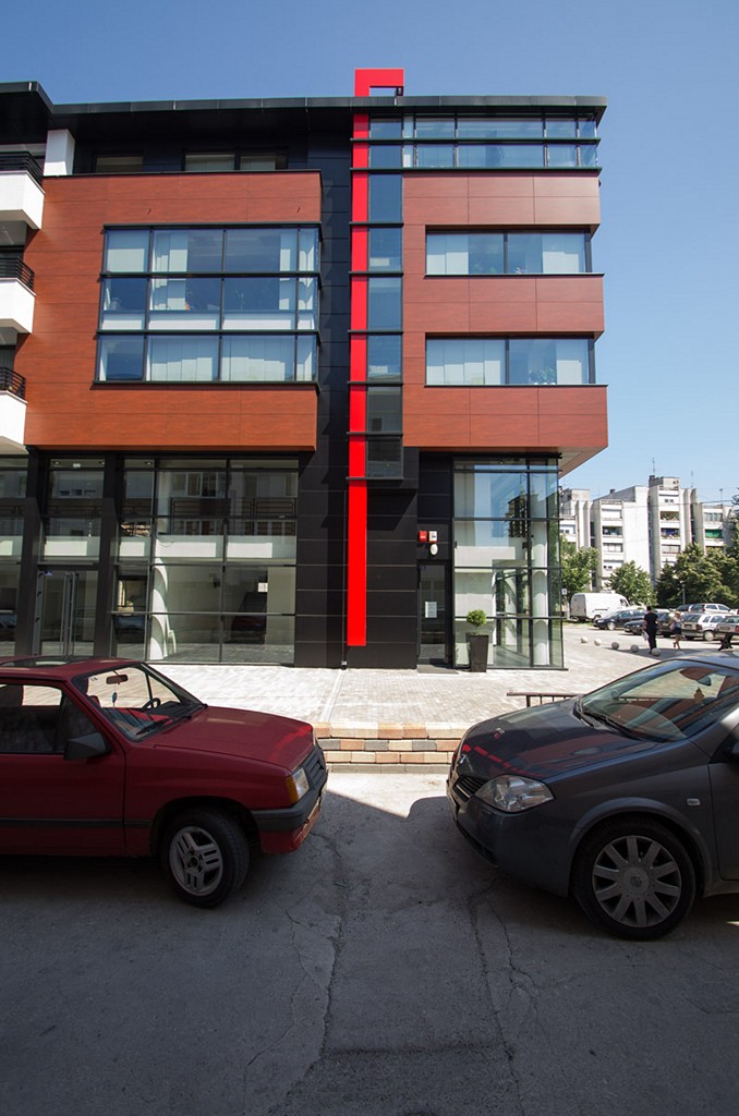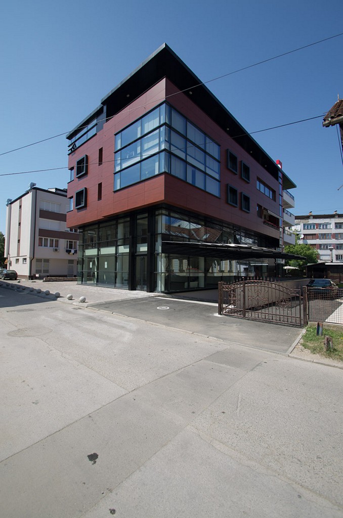 Objekat Agencije za vrjedonosne papire u Banjaluci. Trespa fasada sa ALU prozorima i vraitma, te mali kuriozitet automatske grilje na prozorima.