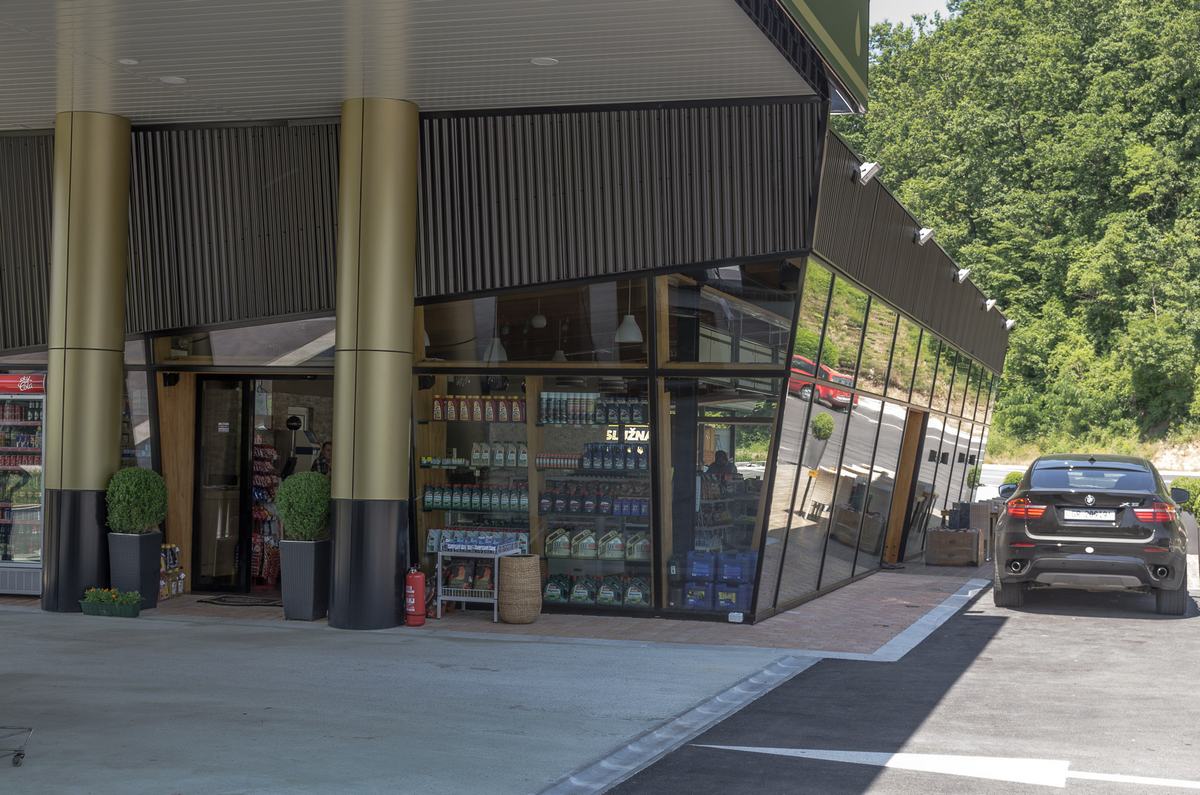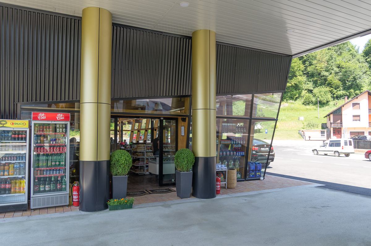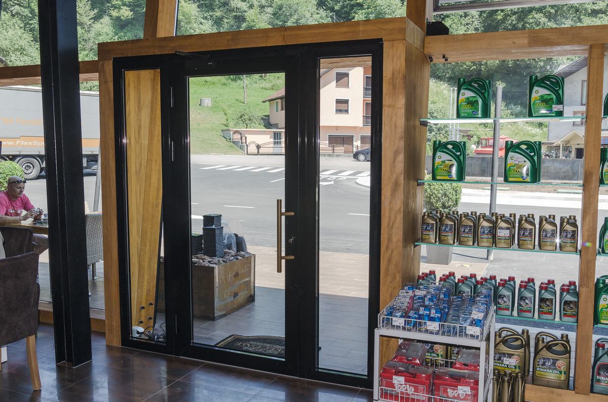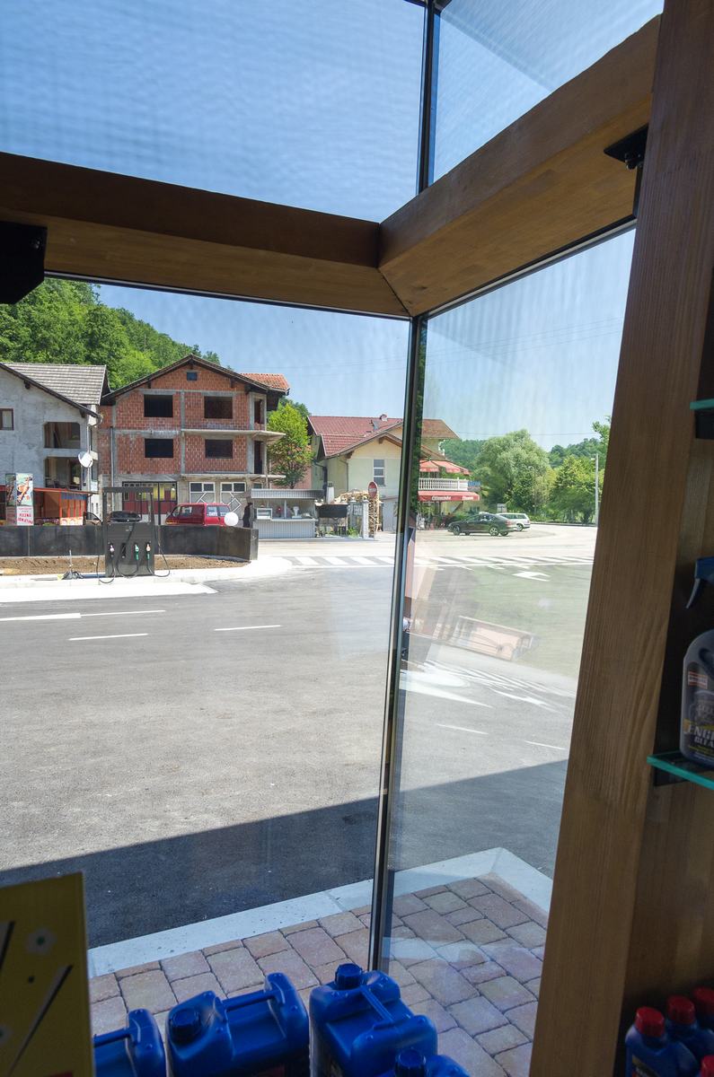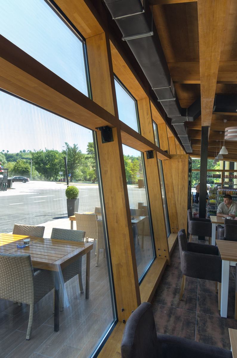 Benzinska pumpa Ibrahimović, odličan primjer uklapanja ALU elemenata i velikih staklenih površina sa unutrašnjošću od drvenih elemenata.