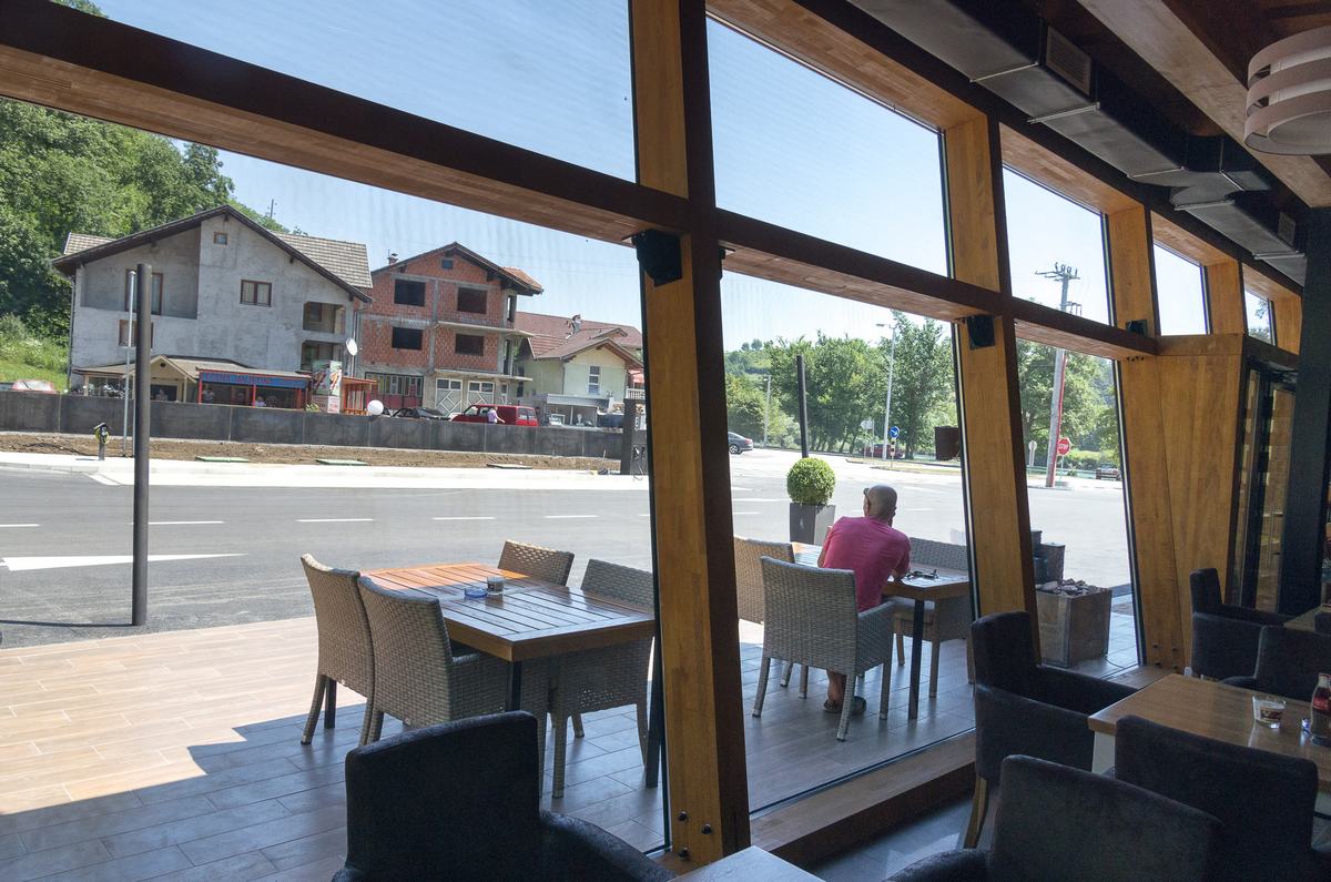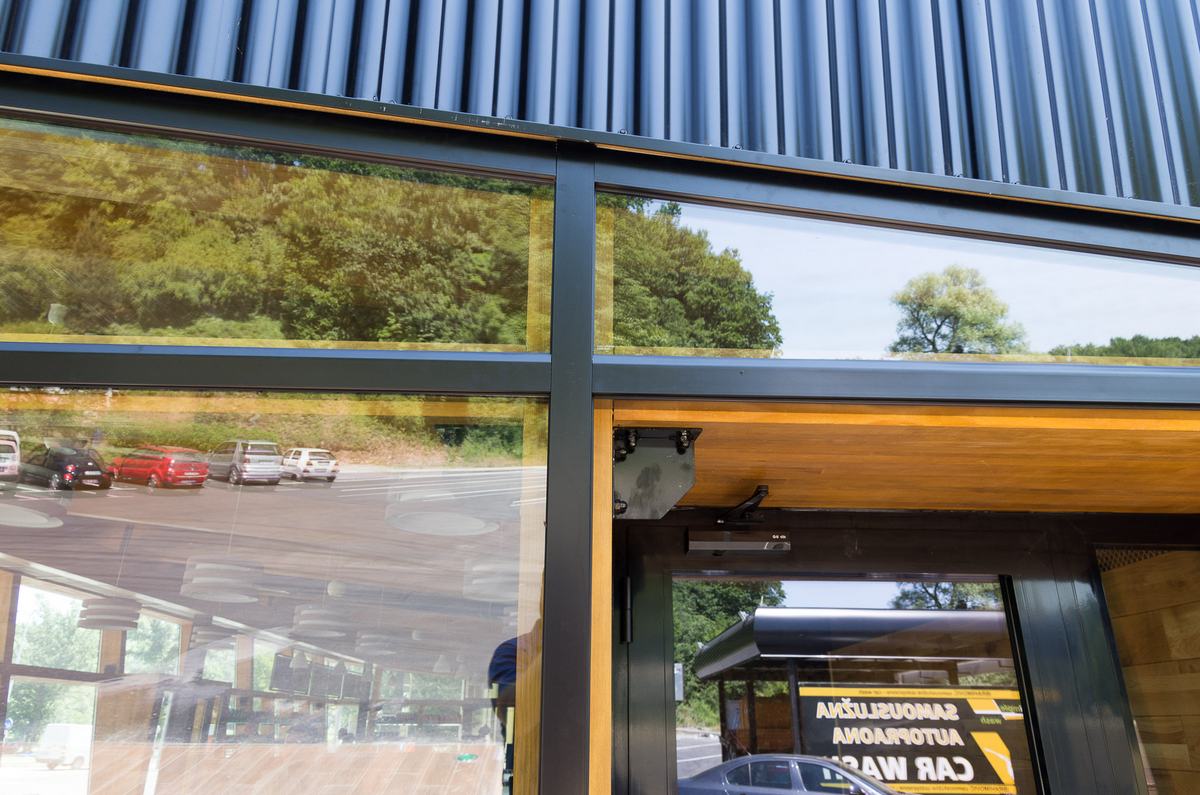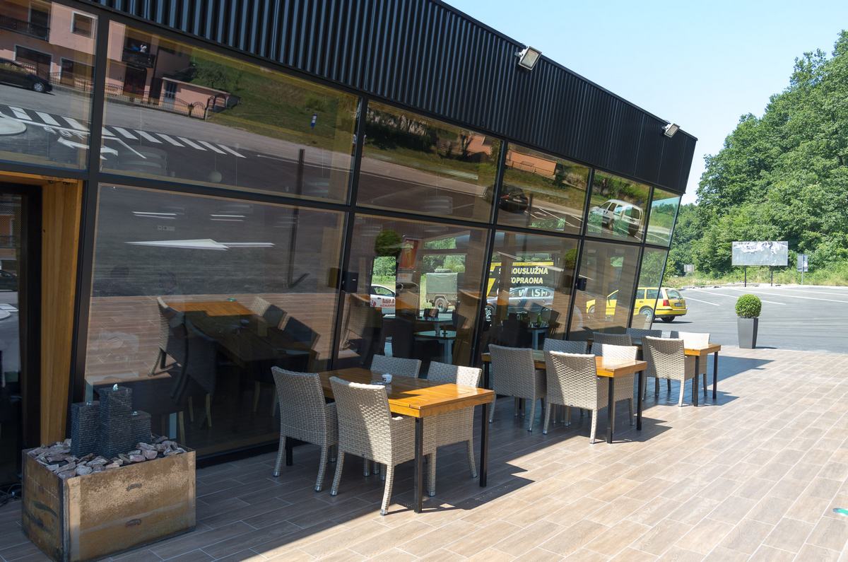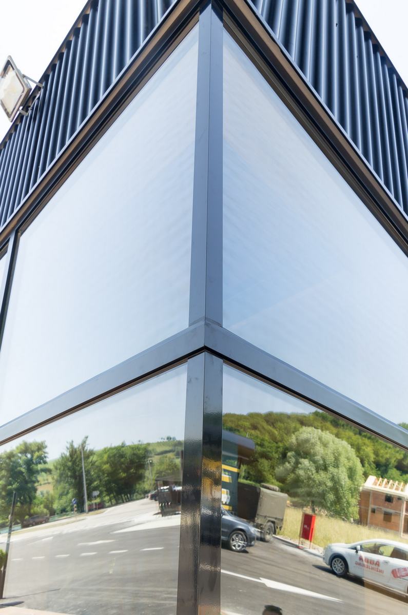 Benzinska pumpa Ibrahimović, odličan primjer uklapanja ALU elemenata i velikih staklenih površina sa unutrašnjošću od drvenih elemenata.