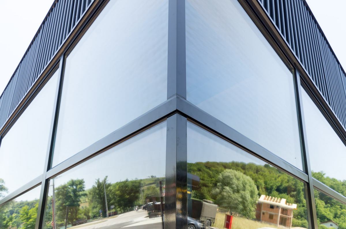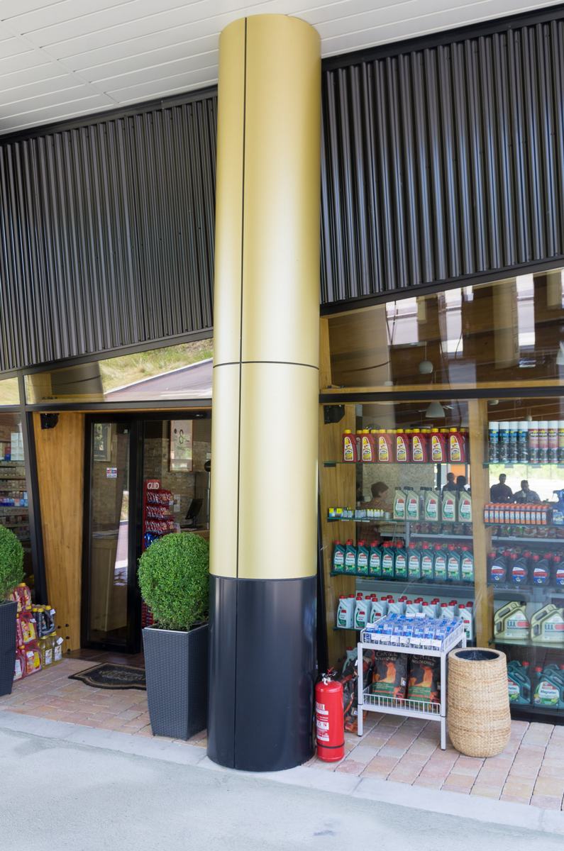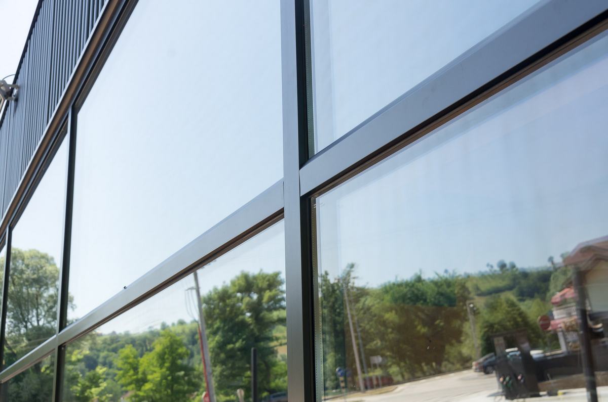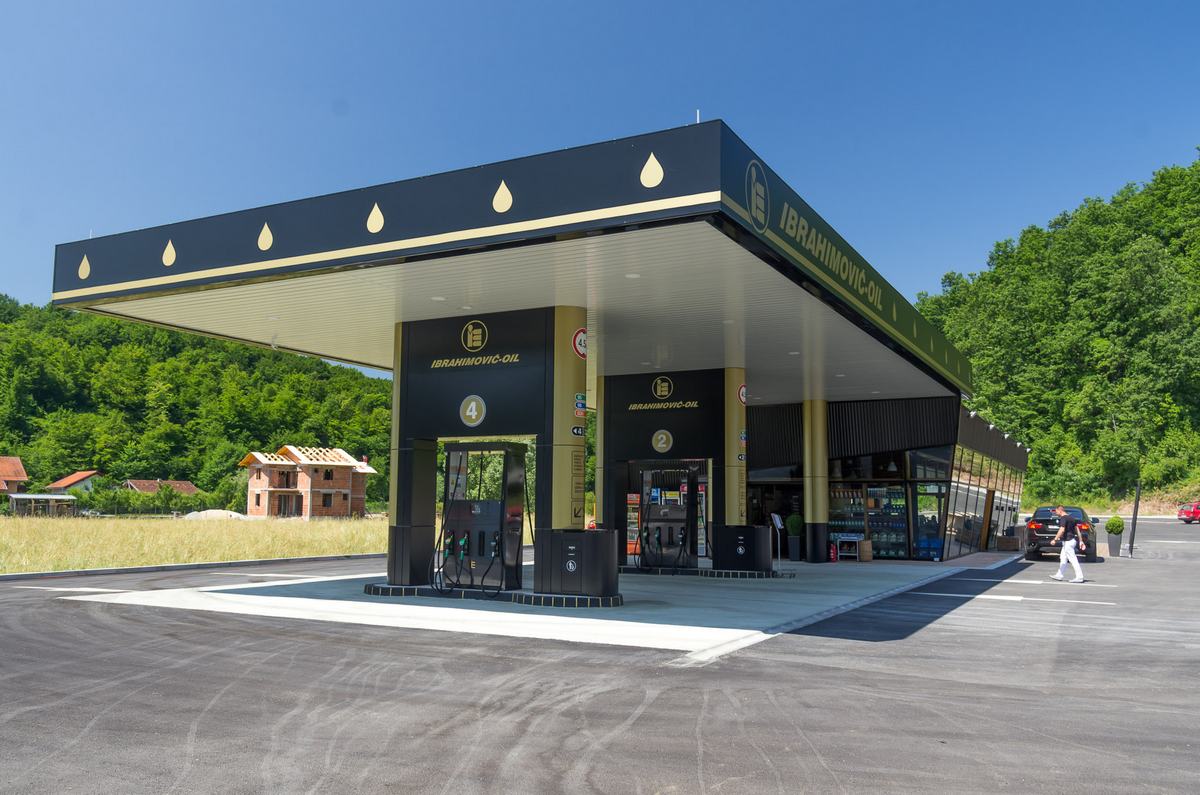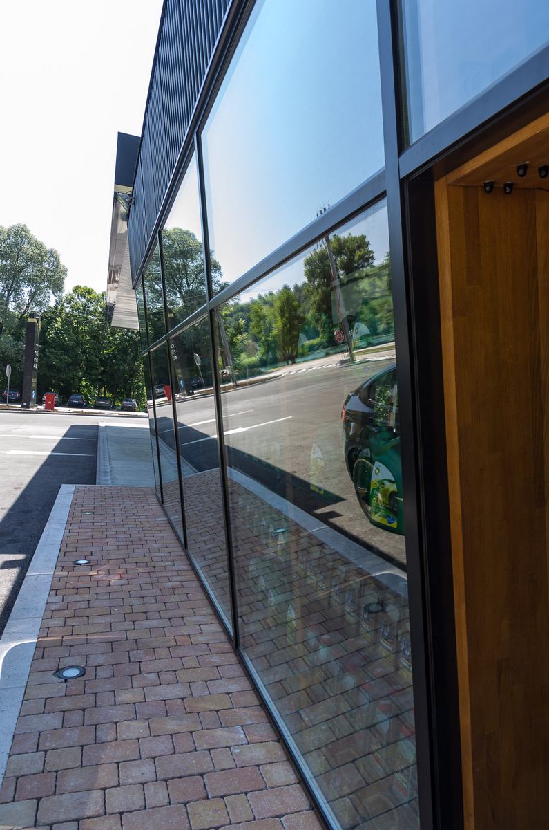 Benzinska pumpa Ibrahimović, odličan primjer uklapanja ALU elemenata i velikih staklenih površina sa unutrašnjošću od drvenih elemenata.